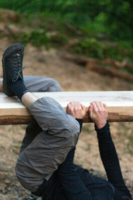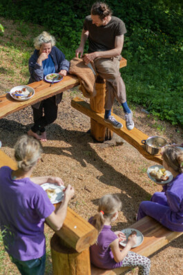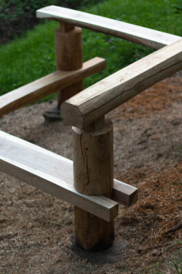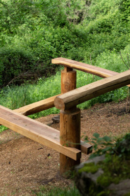 The wood — chestnut and walnut — was sourced locally from fallen and dry-standing trees, with help from the community. We drew inspiration from Japanese carpentry and from the kozolci (traditional hayracks) of the region. Each joint was hand-carved, assembled without reinforcements, only carefully crafted interlocking connections.